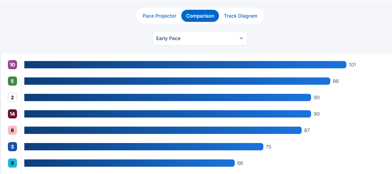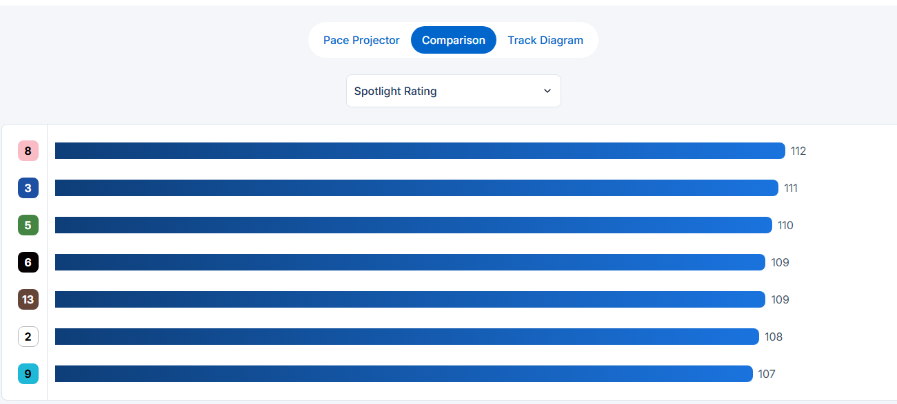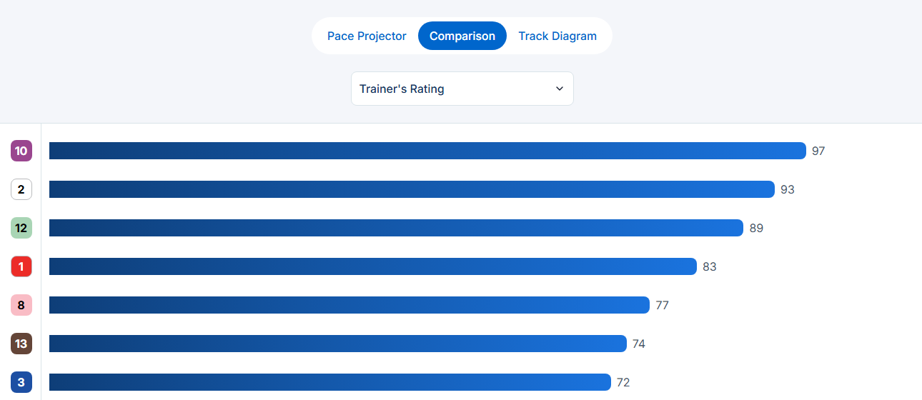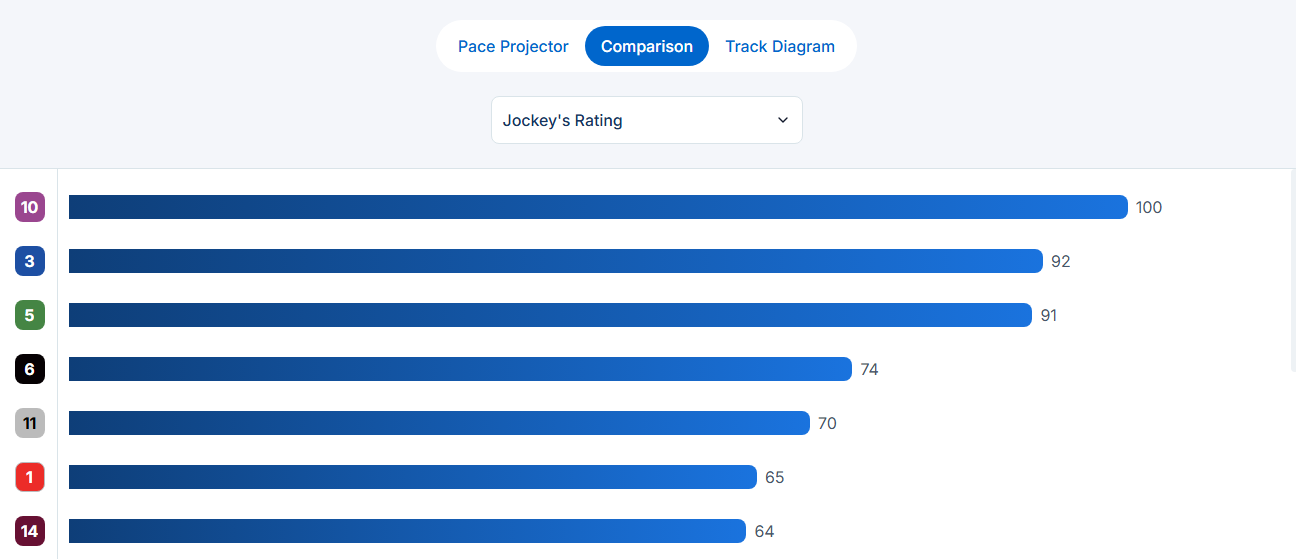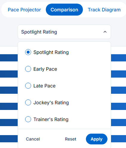 Comparison Chart Daily Racing Form Customer Service April 22, 2026 20:32 Follow Compare horses based on chosen category from options presented in drop down menu: Spotlight Rating: Early Pace: Late Pace: Jockey's Rating: Trainer's Rating: