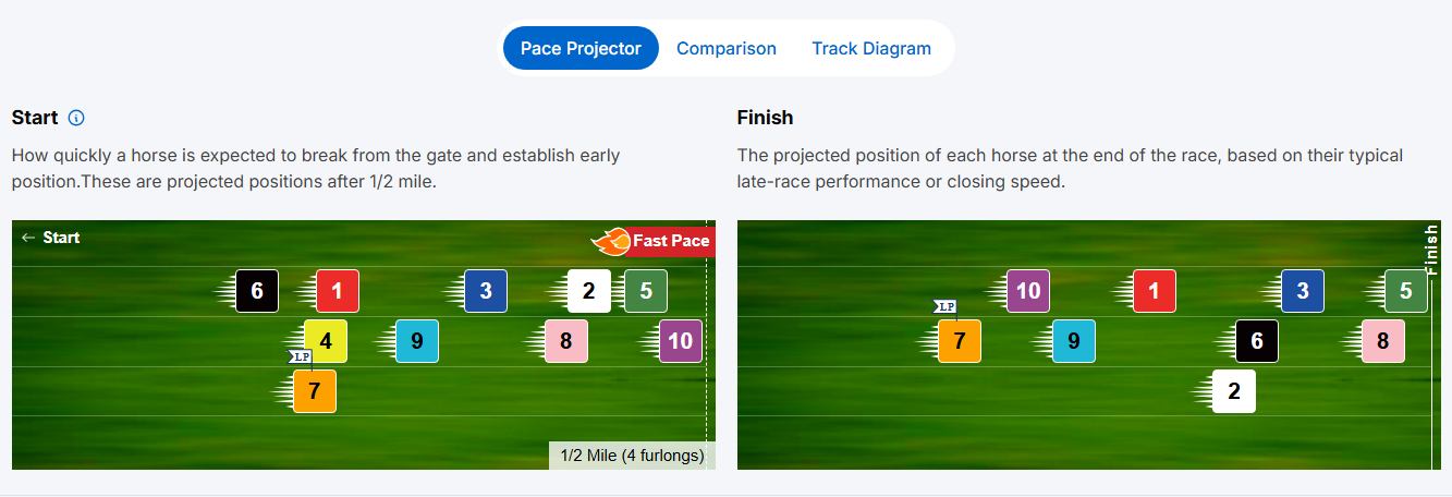 - Running Style: Each horse has a preferred way of running, like being a front-runner or a late closer. The pace projector considers whether the likely pace of the race complements or compromises each horse's style.